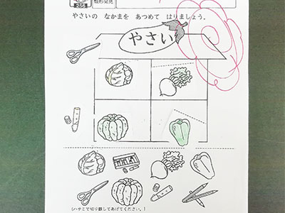 座って行うプリントも、点描、線を引く、シールを貼るなどから始め、だんだんとひらがなのプリント、絵カード、数字カードに移行していきました。