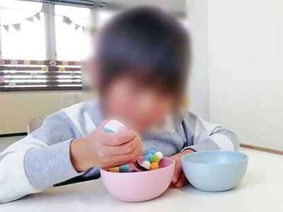 お友達の可能性を信じて課題には1時間ごとにトイレへ誘ったり、手先のトレーニングとして洗濯バサミ、シール貼り、カラーボンボンのプットイン、スプーンの練習を継続します。