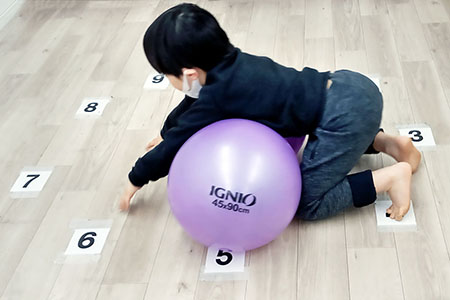 なかなか動けなかったお友達の運動プログラムは、立つ、座る、歩くという動作から、歩く・座る・走る・ジャンプ・手を前に出して掴むといった運動にシフトしていきました。
