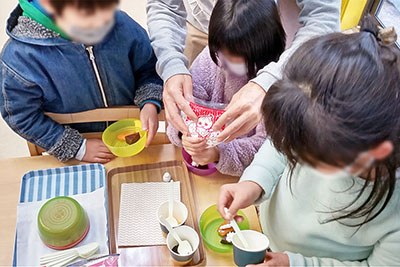 お友達の成長する過程の情緒の安定を促しながら、落ち着いて考えて、正しく行動できるようにと願い、また学習も集団活動もマナーやルールも受け入れられるよう取り組みを続けていきます。