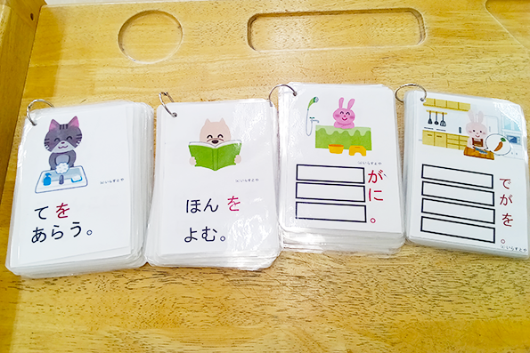 そのような状態の中で、ことばの支援や姿勢・行動への指導がスタートしました。口舌トレーニングや「あいうえお」絵本、助詞カード、構文カードなどを取り入れた支持的なプログラム、さらにOT活動や集団療育(ゲーム・おやつ作りなど)も組み込み、着座維持と興味喚起の両立を工夫しました。