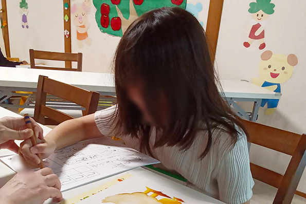 その積み重ねが実を結び、通い始めて約1年半。少しずつ口元を動かしながら1音ずつ声を出すようになり、自分の名前を書くことにも取り組めるようになりました。最近では、気になるお友だちに自分からハグをする姿も見られ、周囲との関わりも広がっています。