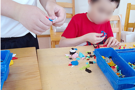利用が始まった頃、お友だちは「思い通りにならない」と強い癇癪を起こしたり、お友だちに手が出てしまったりすることがありました。職員の問いかけにも「分からない」とだけ返す場面が多く、やりとりとしての会話はまだ難しい状態でした。注意が逸れやすく、準備や着替えにも時間がかかってしまうことも……