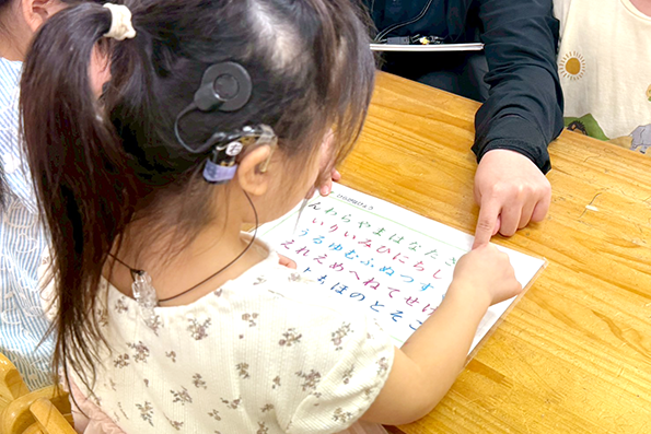 支援が始まった当初は、両耳に人工内耳を装着しており会話は可能でしたが、語彙が少なく、気持ちをうまく伝えることに苦手さがありました。「いや」「やめて」といった簡単な言葉は出るものの、相手の問いに対してはオウム返しで返すことが多く、やりとりの幅はまだ限られていました。