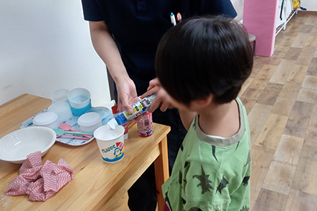 日常の動きの中では、運動や遊びの時間にも参加できるように手添えで関わり、安心感を持ちながら活動に入れるよう促しました。また、トイレについては保護者様と一緒に事業所のトイレに入る練習から始め、少しずつトイレに慣れる支援も行いました。好きな活動や興味のある遊びを入口にすることで、事業所内の雰囲気に馴染むきっかけをつくりました。