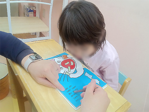 発語の明瞭化に向けて、絵本の音読を職員やお友だちと一緒に行うことで、言葉のテンポや発声の仕方を少しずつ習得。