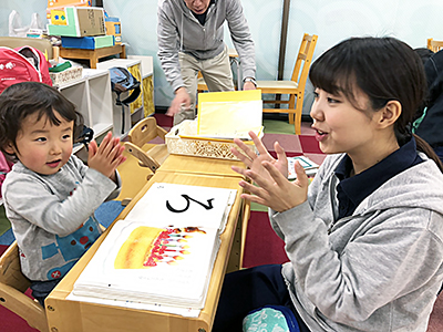 絵本を見ながら、先生の真似をしています。