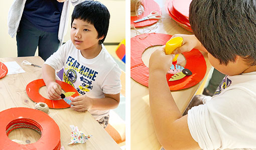 用意したのは丸い台紙、それにお友達がそれぞれお手本を見ながら作った鶴や扇などお正月らしい折り紙が飾られていきます。