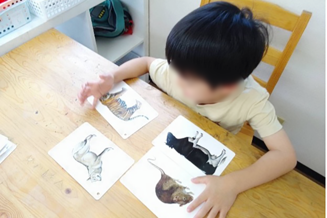 オリジナル教材を使って学習を行い、一対一・小集団で静・動の繰り返しのある運動遊びを行なっています。